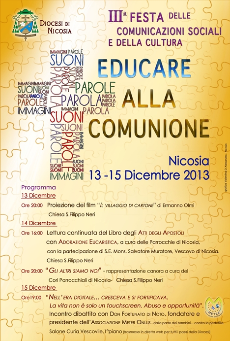 “PAROLA. . .parole, immagini e suoni. Educare alla Comunione”. E’ il titolo della 3a Festa Diocesana delle Comunicazione Sociali e della Cultura “Siamo chiamati a fare un’alleanza positiva con i mezzi di comunicazione sociale” . che si aprirà venerdì 13 Dicembre a Nicosia (En). L’iniziativa, voluta ed organizzata dall’Ufficio diocesano Comunicazioni Sociali in collaborazione con l’Ufficio diocesano per la Cultura, si pone come ponte ed in stretta continuità tra la seconda edizione dello scorso anno, che con la pubblicazione della Lettera Pastorale del Vescovo Salvatore Muratore alla Diocesi nicosiana, dal titolo "Tessitori di Comunione" e supportare così l’avvio della prima Visita Pastorale alla Diocesi. Già più volte ed in diverse occasioni, infatti, Mons. Muratore si è soffermato sull’importanza di questo speciale ambito pastorale, affermando che