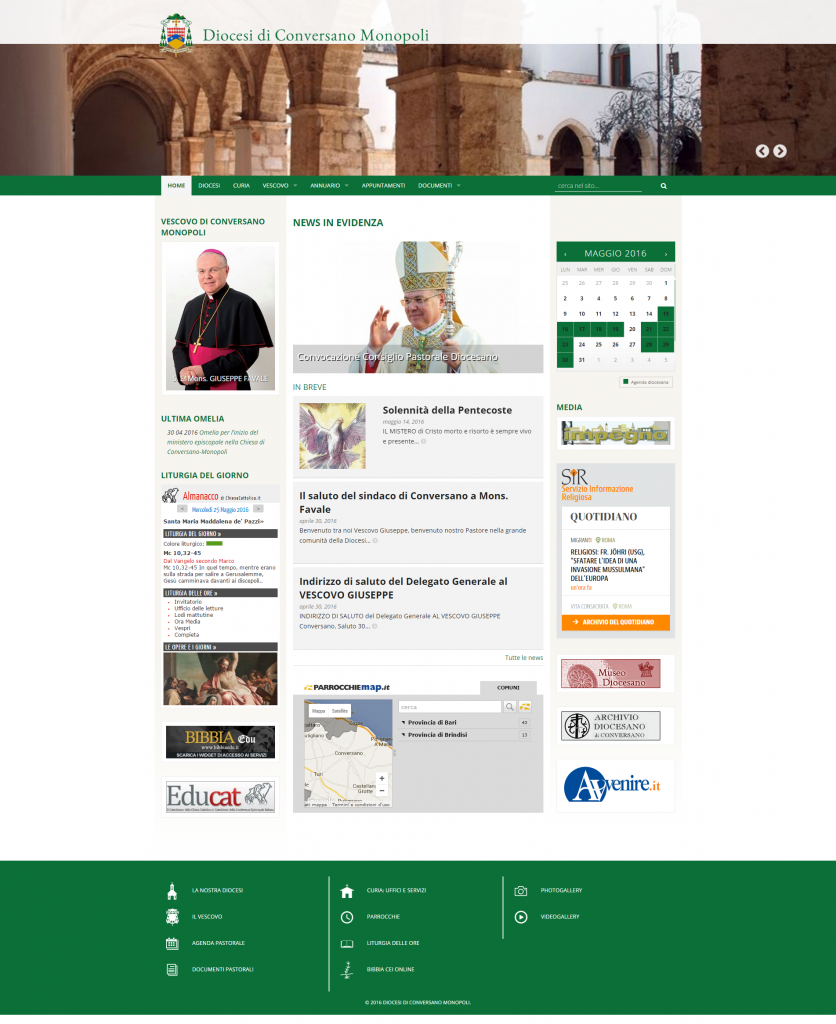È online dal 20 maggio il nuovo sito della Diocesi di Conversano Monopoli, completamente riprogettato e realizzato per seguire le opportunità legate alle nuove prassi digitali e tenendo conto della consolidata diffusione della consultazione dei siti da smartphone e tablet. Questo ha implicato la necessità di riorganizzare i contenuti a tutti gli schermi, presentandoli in modalità adatte ai dispositivi mobili.