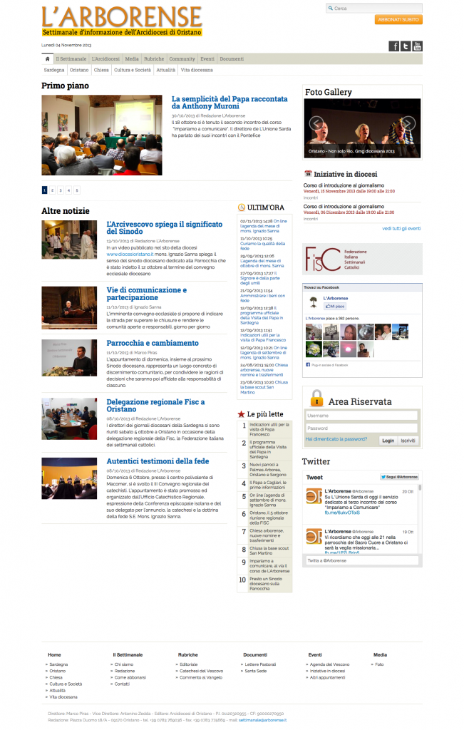 E’ online dal 12 settembre scorso il sito dell’Arborense, settimanale d’informazione dell’Arcidiocesi di Oristano. Il settimanale ha preso il posto dello “storico” giornale Vita Nostra, nato nel 1960, e si presenta anche sul web con un’offerta di contenuti che integra e affianca la versione cartacea.