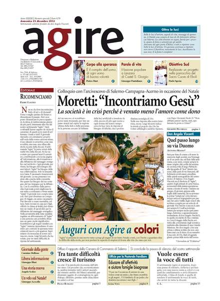 Domenica 23 dicembre 2012 ritorna il settimanale cattolico “Agire”. Dopo un periodo di inattività dovuta a problemi logistici ed organizzativi, il settimanale ritorna ad informare, con una nuova veste grafica, a colori e con un formato più snello, ricco di contenuti.